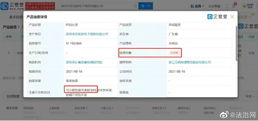 近期,国度阛阓监督处治总局开展抽检。在检测经过中,一件标称为深圳市安若依电子商务有限公司分娩的前卫女装,被检出一种名为“联苯胺”的可致癌芳醇胺染料超标,而况超标极端严重。记者探听了解到,由可致癌芳醇胺合成的染料,在与东谈主体始终战争的经过中,其无益因素被皮肤摄取,在特等条目下明白产生20多种致癌芳醇胺,酿成致癌芳醇胺化合物,经度日化作用而改革东谈主体的DNA结构,可能引起病变和诱发恶性肿瘤物资,导致膀胱癌、输尿管癌、肾盂癌等恶性疾病。