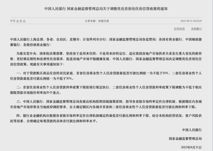 8月31日晚间,中国东说念主民银行、国度金融监督处置总局聚会发布《对于退换优化离别化住房信贷战略的见知》和《对于裁汰存量首套住房贷款利率计划事项的见知》。